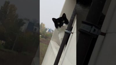 En kat ser med stor nysgerrighed to unge rygere i næste balkon.