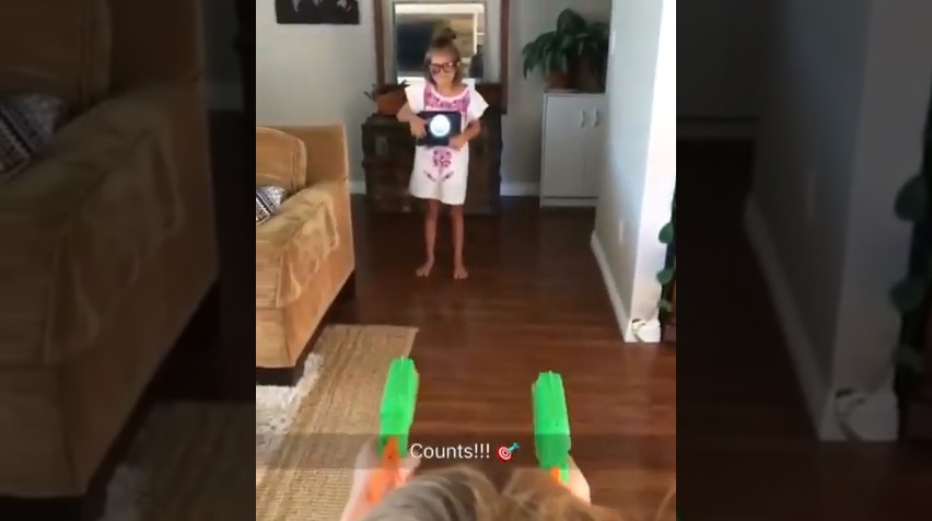 I byen Vista Californien, en lille pige i besiddelse af et mål for den lillebror, der ønsker at spille skyde med to plastik kanoner Nerf. De unge skud og de to pile holde sig til briller søster, der bor sammen med sin mund åben.