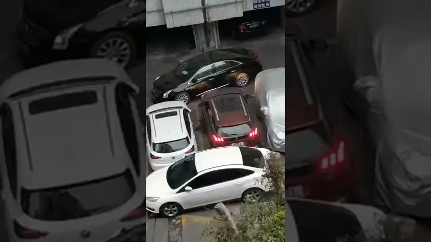 I en park i Kina, en chauffør synes at have stukket af et andet køretøj parkeret foran. Uden tøven, vil ramme bilen med sin egen, indtil du skubbe nok til at få.