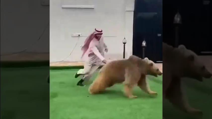 En mand i Saudi Arabien spiller chase med hans kæledyr bjørn.