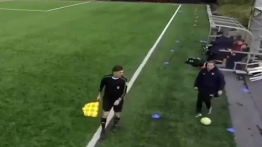 Under en amatør fodboldkamp i Sverige, Et mål vil blive skubbet af vinden på banen.