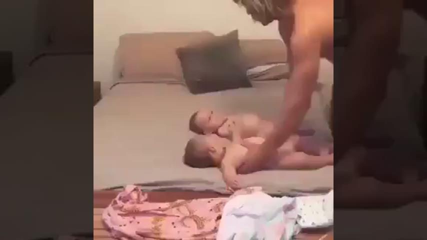 Den vanskelige opgave far til at ændre bleer af babyer uregerlige tvillinger.