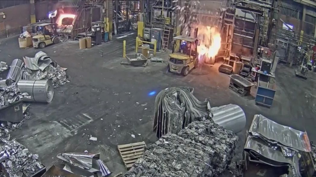 Operatør i en gaffeltruck mekanisme forårsager voldsom stråle af smeltet metal i en støbning, som hun placeret en stor stykke metal i en ovn. Heldigvis, arbejdstageren blev beskyttet mod forruden gaffeltruck.