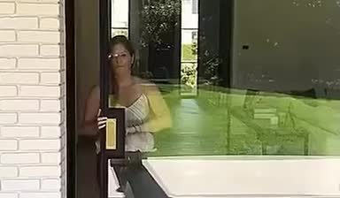 En kvinde støder på en glasdør