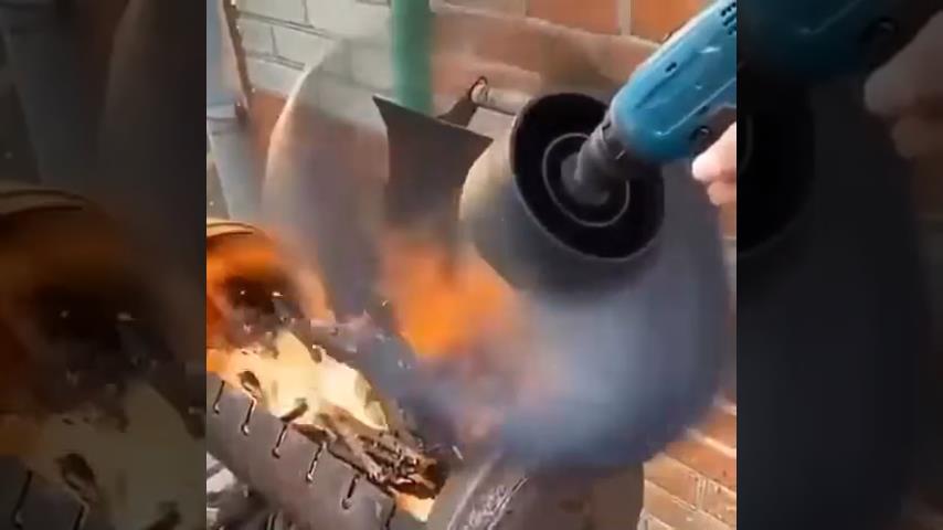 En mand bruger en bådpropell på en elektrisk bore, som en blæser til ilden på hans grill.