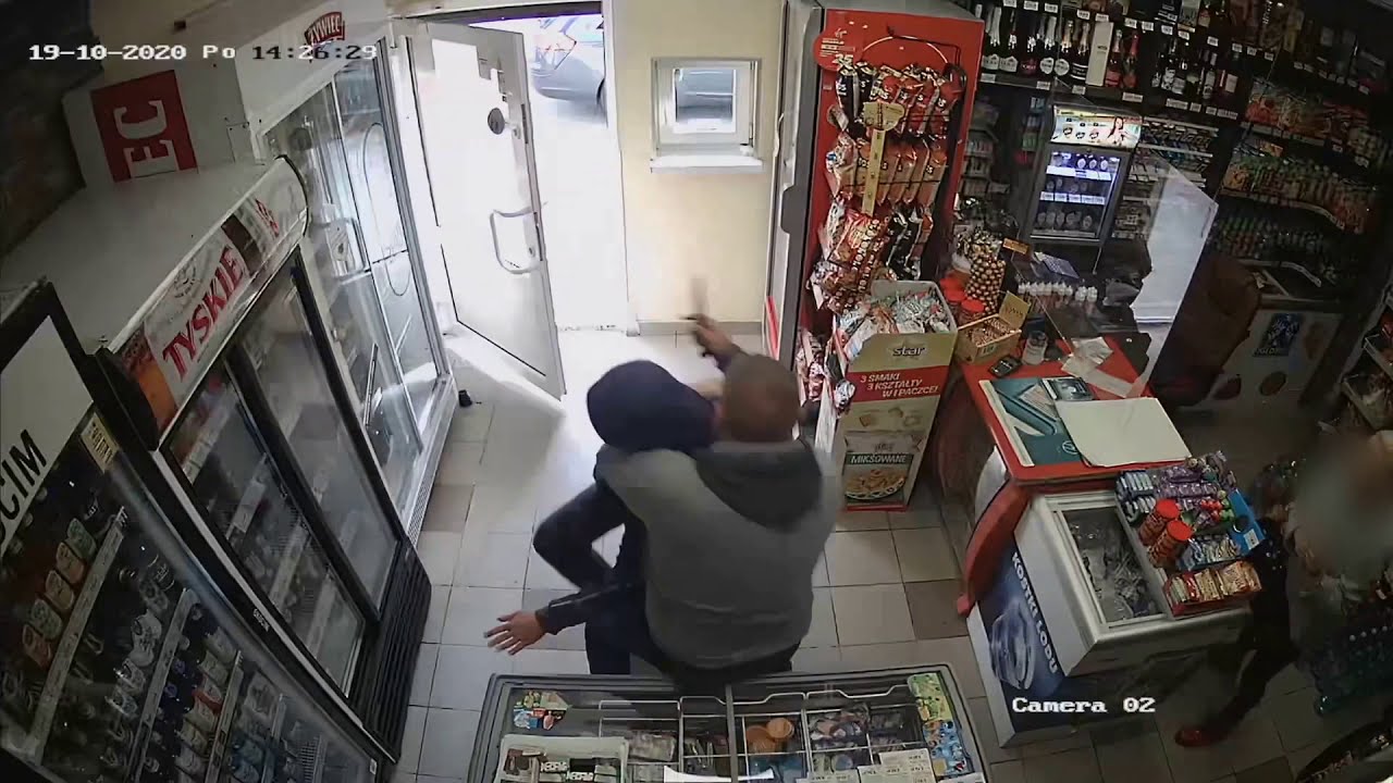 Hændelsen skete den 19. oktober 2020 i byen Ostróda i Polen. En røver brød ind på et minimarked og truede kassereren med en stor kniv. Efter et stykke tid ankom ejeren der, der ikke tøvede med at konfrontere røveren og afvæbne ham.