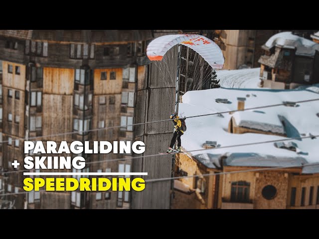 Speed-svævefly Valentin Delluc udfører et par tricks i det øde feriested Avoriaz (Morzine, Frankrig).