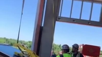 Arbejdere på en højhus løfter en stor facadeglasenhed.