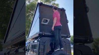 Et optrækbart tagtelt kaldet Redtail RT 90. Indeni er der batterier og blæsere, mens der er solpaneler på taget.