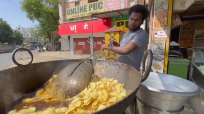 Medarbejderen i en street food kantine i byen Nashik, Indien, viser os, hvordan man tilbereder chips.