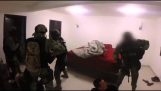 En brandmand forsøger at bryde glasdøren i en bygning med en slegge, men døren er ikke låst.