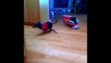 På tæppet i et hus i St. Louis, USA, en pitbull hund tygger et legetøj og starter en ild...