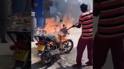 Et geni åbner tanken for en brændende motorcykel, med en skovl. Endelig ja, skete hvad du tænkte på.