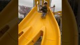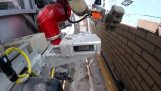 På en byggeplads, Arbejdstagere udviklede et system til indlæsning af mursten i en klapvogn uden trætte. Mursten ruller i et lysbillede, Bouncing af et dæk og land i en klapvogn.