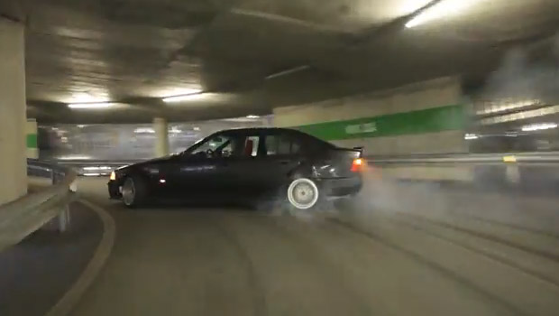 Vytenis Retrosius fra Litauen laver en utrolig drift med en BMW 325 på en lukket parkeringsplads.