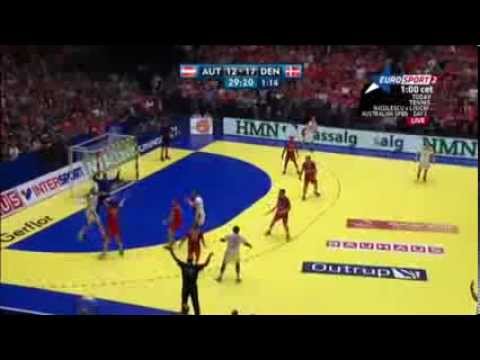 Den danske håndboldspiller Mikkel Hansen lykkes en tilsyneladende umulige mål, udnytte untuneful i bold.