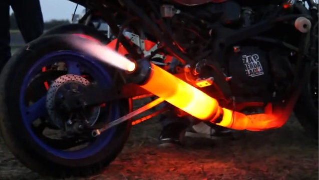 En motorcyklist i Polen varmer så meget motorens udstødning, indtil denne pyrwnei og trækker sig en rød flamme fra dysen.