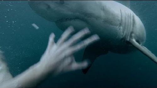 En mand, der gør en splash i Sydney Harbour i Australien, konfronteret med en hvid haj. Mobbet og forsøger at komme ud straks fra vandet, Mens shark syntes mere nysgerrige end aggressive.
