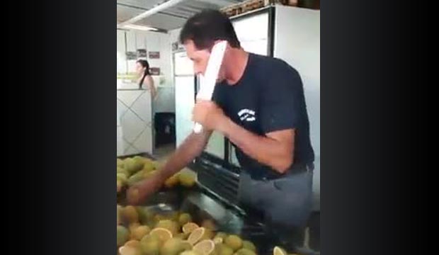 I Brasilien, en mand skåret en bunke af citroner med meget hurtige bevægelser og ved hjælp af en stor kniv.