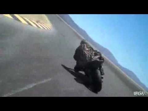Denne motorcyklist sænker så meget hans krop under en tur, Så hovedet at røre asfalt
