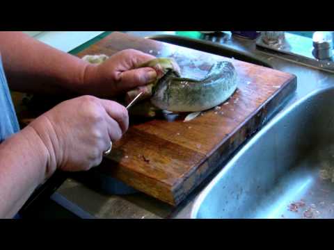 denne fisk er en bowfin og 40 minutter efter hovedet var væk og skoldes den stadig i live