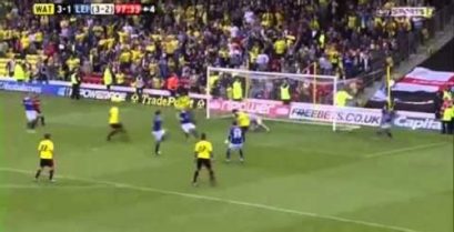 Vi er i de 96 th minut straf og godkendt for Leicester City, som vil sende holdet til finalen i Play Offs. Modstanderen Watfords håb begynder at svinde...