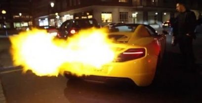 Flammer fra udstødning af en McLaren MP4-12 c i London street.