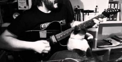 Guitaristen Tony Martinez forsøger at spille guitar, men katten har en appetit for spil.