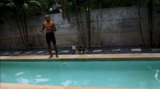 For at uddanne sig til Triathlon, en mand lavet en uendelig pool. Bare hooked med en elastisk tov på et træ, og så hun kan bade uden at store rum.