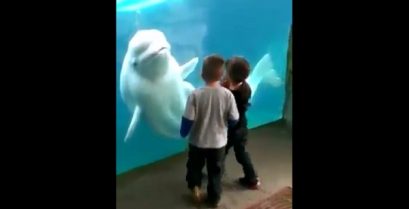 I byen af Mystic Aquarium i Connecticut, en hvidhval hval morede drillende små børn. Nærmer sig den glaseret med hastighed og åbner munden at skræmme.
