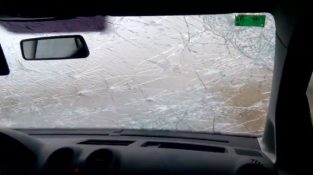 En meget stærk hagl i Chelyabinsk i Rusland ødelægger helt forruden af en bil.
