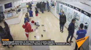 Julemanden stjal den bærbare computer fra Apple Store i TbilisiDansende mand klædt ud som julemand rakte dyr bærbar ud af butikken i Tbilisi, Apple sælger apparater.