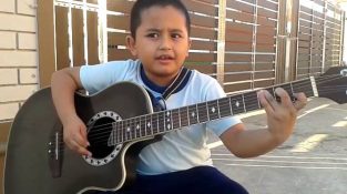 Lidt Azry fra Malaysia er kun 7 år, men han kan spille guitar og synge Metallicas 'Nothing Else Matters' meget godt.
