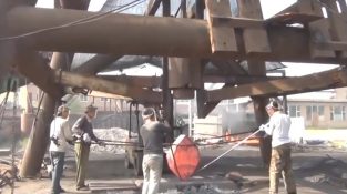 Kinesiske smede smede et stykke metal i en gigantisk hammer, for at opbygge en stor flange. Teamwork og præcision peger på sådan en stor skala er imponerende.