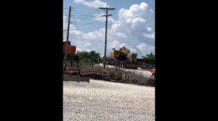 Et tog rammer en gravemaskine på en trailer, der sidder fast på et jernbanespor.