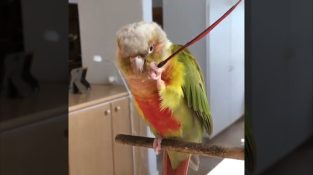 Denne papegøje bruger en fjer som et redskab der skal skrabes. Efter at have fanget den fløj med sine kløer, passerer bunden af ansigtet og halsen peger at nyde.
