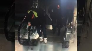 I en butik i Vladivostok Rusland, en mand vil se rulletrapperne gribe hans sko og 'sluge' dem.
