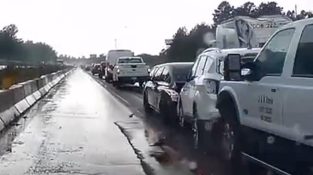 En chauffør i USA undgår med nød og næppe en større bilulykke, når køretøjerne foran ham bremser kraftigt.