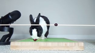 En kanin, der spiser tranebær, han mister pludselig sin balance.