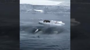 Mens et segl søgte tilflugt i et lille stykke flydende is, tre spækhugger skaber en bølge for at ryste isstykket og få forseglingen til at falde i vandet.