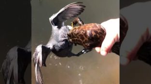 I Livingston, USA, en mand frigiver en søl, hvis hoved var fanget i munden på en bøffelfrog på overfladen af en sø.