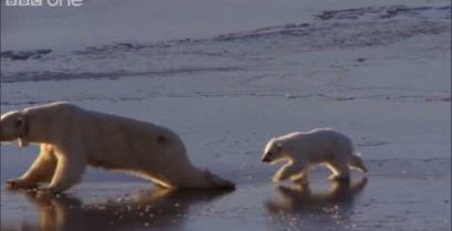 Μια πολική αρκούδα με το μικρό της κάνουν το πρώτο τους ταξίδι μαζί πάνω από τον πάγο της θάλασσας