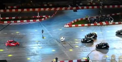 Ποδόσφαιρο με αυτοκίνητα από τους συντελεστές του Top Gear, στα πλαίσια του σόου «Top Gear Live». Σχολιαστές είναι οι Jeremy Clarkson και Richard Hammond.