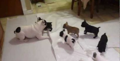Ο Sonny το γαλλικό μπουλντόγκ παίζει με τα 6 εβδομάδων κουτάβια του.