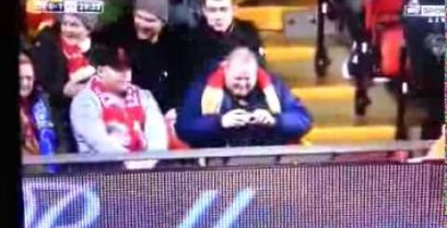 Οπαδός της Λίβερπουλ σπεύδει να τραβήξει μια φωτογραφία γελώντας, όταν παίκτης της αντίπαλης ομάδας πέφτει μπροστά του.