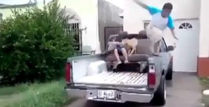 Ένας πιτσιρικάς σκοντάφτει και πέφτει από ένα ημιφορτηγό, αλλά θα έχει την τύχη με το μέρος του.