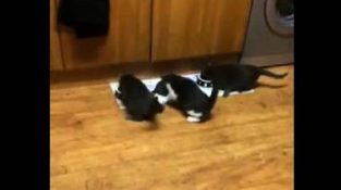 Τρία γατάκια τρέχουν με μανία να φάνε το φαγητό τους μόλις ανοίξει η πόρτα της κουζίνας.