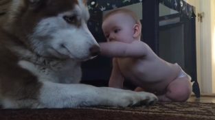 Ένα αξιολάτρευτο χάσκι ανταποκρίνεται στο κάλεσμα ενός μωρού και ξαπλώνει για να παίξει μαζί του.