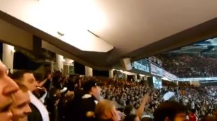 Οι οπαδοί της Άιντραχτ Φρανκφούρτης τραγουδούν χοροπηδώντας στις κερκίδες, οι οποίες φαίνεται να έχουν αρκετή ελαστικότητα για τέτοιου είδους πανηγυρισμούς.