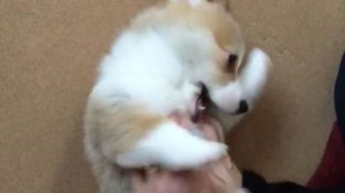 Μια γυναίκα γαργαλάει ένα κουτάβι ράτσας κόργκι, το οποίο φαίνεται να το απολαμβάνει. Όταν η γυναίκα σταματά, ο μικρός σκύλος κάθεται ανάσκελα σε θέση αναμονής.